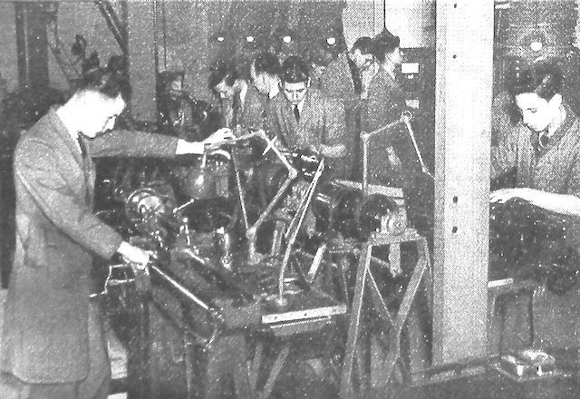 As a senior technical school educating the under fifteen boys it was included in the Pied Piper arrangements for evacuation and found itself billeted at St Albans. As their educational base the school was allocated to St Albans' School at Abbey Gateway. Photographed by the Herts Advertiser in 1940 and headed Engineers of the Future, the annotation states the pupils were evacuated from London and are shown "in the workshop which they have fitted up in a room loaned to them by Mr W T Marsh, Headmaster."
